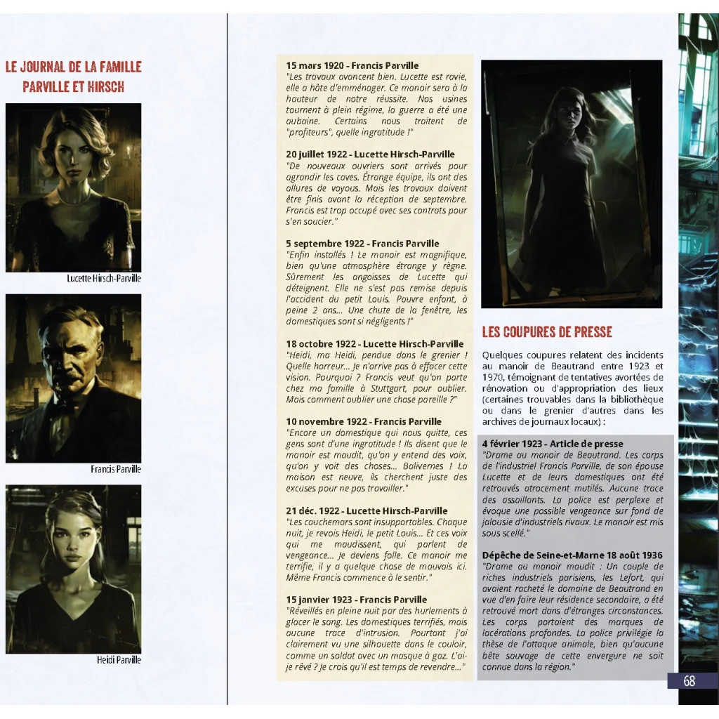 • Le manoir Beautrand : Un mystérieux manoir hanté défie toute logique. Les enquêteurs sont appelés en renfort pour percer ses mystères et affronter les revenants.