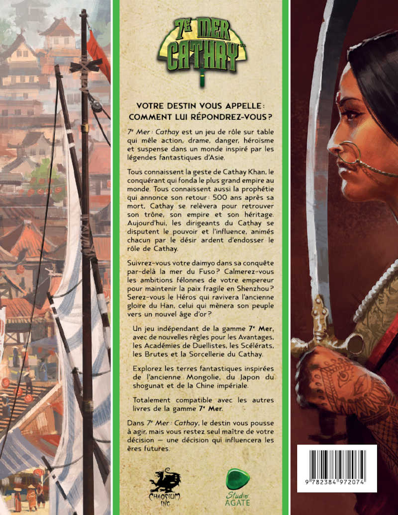 7e Mer: Cathay est un jeu de rôle sur table qui mêle action, drame, danger, héroïsme et suspense dans un monde inspiré par les légendes fantastiques d’Asie.