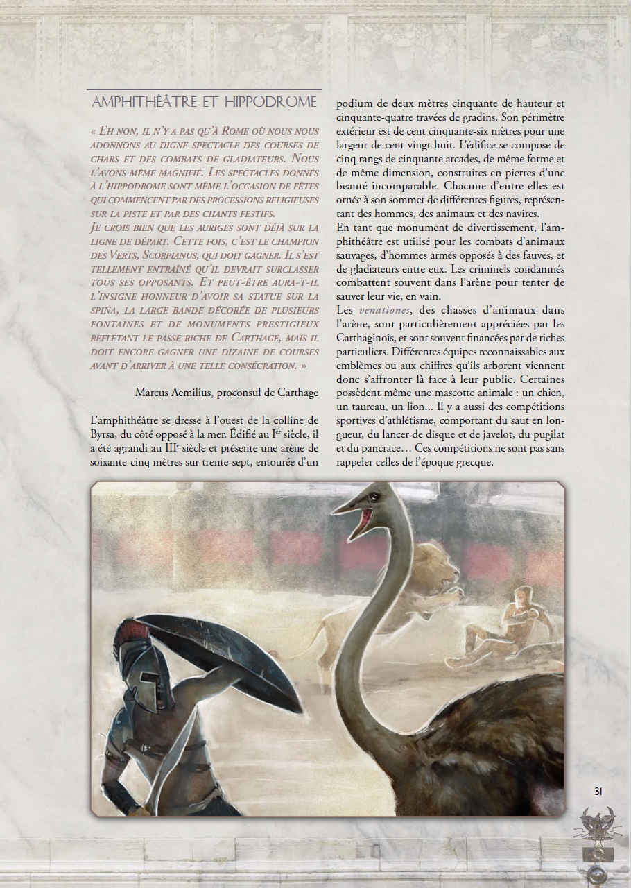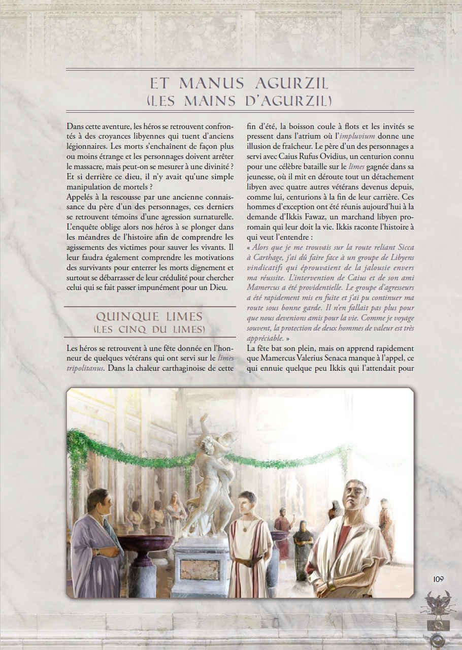 Ce supplément vous propose la description de plusieurs cités antiques d’Afrique du Nord, ainsi que les peuples et les coutumes de cette région.Tout au long des visites de Carthage, Césarée ou encore Leptis Magna, les lacunes de l’histoire et les légendes nous ont permis de broder plusieurs aventures.