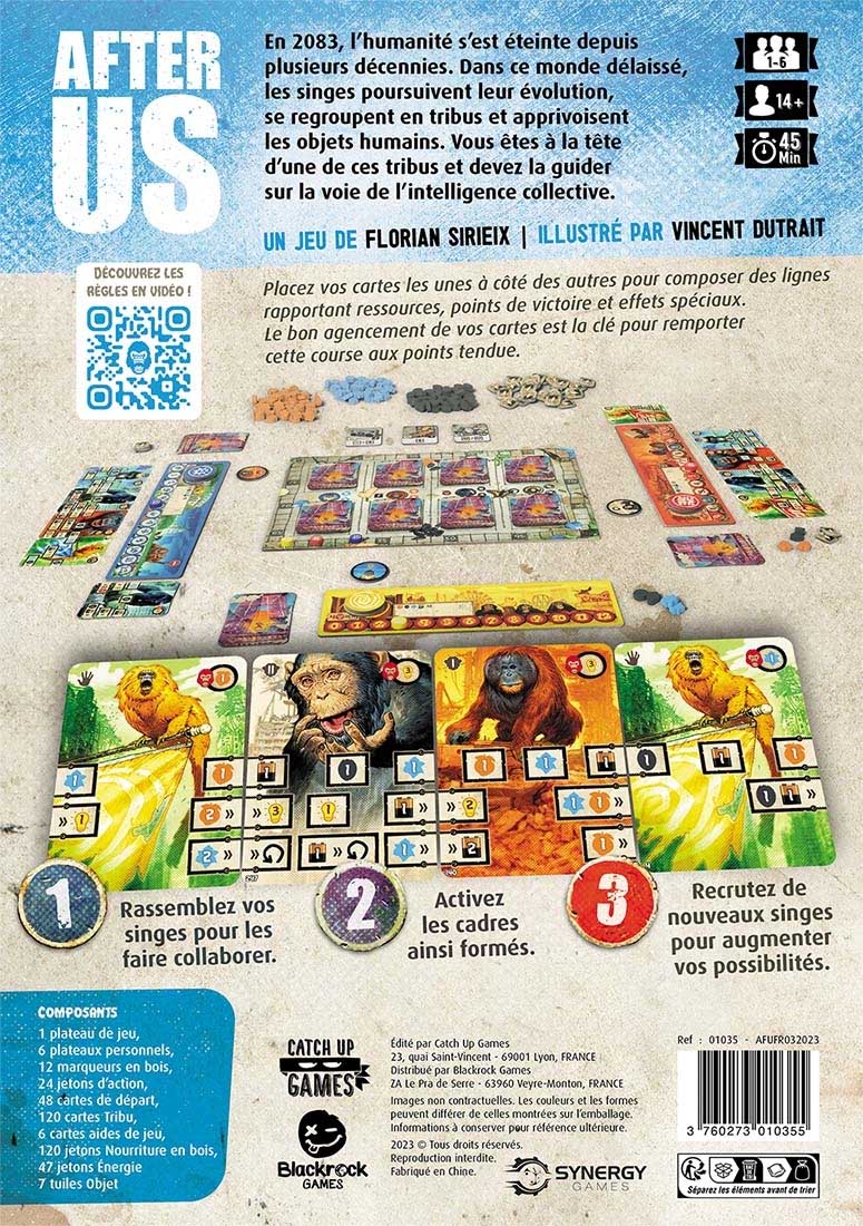 Pour l’emporter dans le jeu de Deckbuilding After us, vous devez atteindre 80 points de victoire avant vos adversaires. À chaque tour, tous les joueurs vont simultanément piocher les 4 premières cartes de leur deck puis les assembler, de gauche à droite, pour former des cartouches d’activation. Ils vont ensuite résoudre ces cartouches, un par un, de gauche à droite, pour gagner des ressources, des points de victoire ou activer les capacités spéciales de leurs primates. Tout le sel du jeu consiste donc à réaliser son assemblage judicieusement, en fonction de ce qu’on souhaite obtenir des cartes que l’on a piochées.