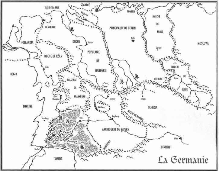A tout seigneur tout honneur, la plus grande partie de ce supplément se concentre sur la Germanie, patrie de la famille d’Hawkmoon; son histoire, sa géographie, ses luttes politiques et militaires, et bien sûr ses principales personnalités sont décrites en détail. Des hautes tours de la Cité Princière de Berlin aux profondeurs terrifiantes de la Schwarzwald, la vie en Germanie n’est pas de tout repos.