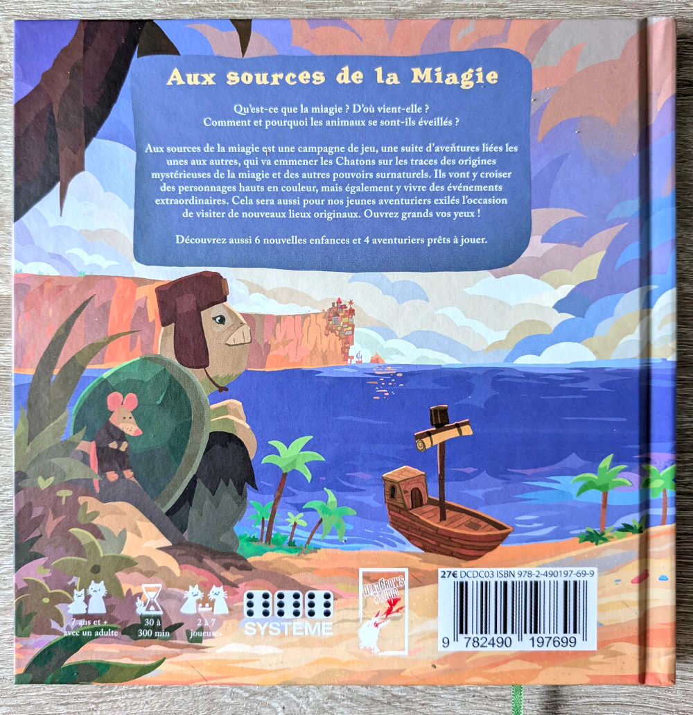 Aux Sources de la Miagie est une campagne, une suite d’aventures liées les unes aux autres, qui va emmener les Chatons sur les traces des origines mystérieuses de la miagie et des autres pouvoirs surnaturels. Ils y croiseront des personnages hauts en couleur, mais également y vivre des événements extraordinaires. Cela sera aussi pour nos jeunes aventuriers exilés l’occasion de visiter de nouveaux lieux originaux. Ouvrez grands vos yeux!