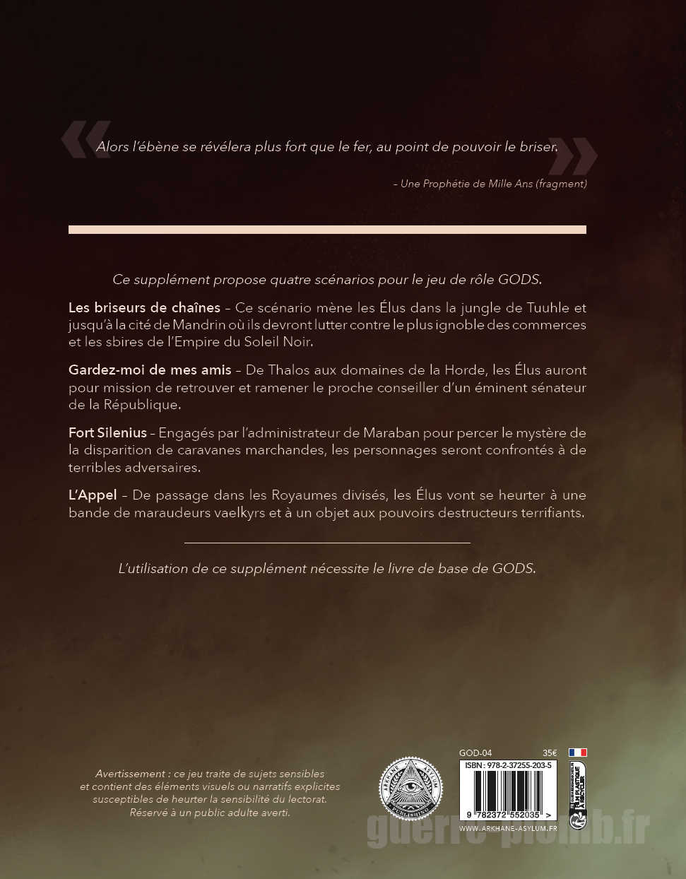 Les briseurs de chaînes – Ce scénario mène les Élus dans la jungle de Tuuhle et jusqu’à la cité de Mandrin où ils devront lutter contre le plus ignoble des commerces et les sbires de l’Empire du Soleil Noir.