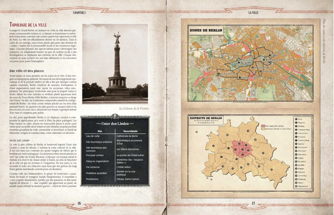 Ce livre présente un aperçu de la ville de Berlin des années 1920 telle que les visiteurs et les habitants la connaissent à l’époque. Vous y trouverez des conseils pour créer des investigateurs destinés à une campagne locale, ainsi que des organisations pour vous aider à assurer la cohésion du groupe. L’ouvrage présente les personnages remarquables du contexte, les sites importants, ainsi qu’un système simple permettant de générer les détails du paysage urbain à la volée. Le Gardien y trouvera également des détails sur le crime et la justice, la pègre locale et la jet-set, afin d’appréhender ce qui fait de Berlin une ville unique.