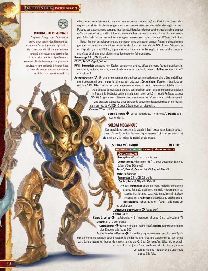 Parmi ces pages, vous trouverez des automates vrombissants, des troupes en marche, des scélérats maudits, des animaux sauvages et d’autres créatures qui peuvent servir d’alliées ou d’adversaires au cours de vos parties. Cet ouvrage vous présente en détail des centaines de nouvelles créatures et approfondit également une myriade de monstres présentés dans les deux premiers Bestiaires Pathfinder.