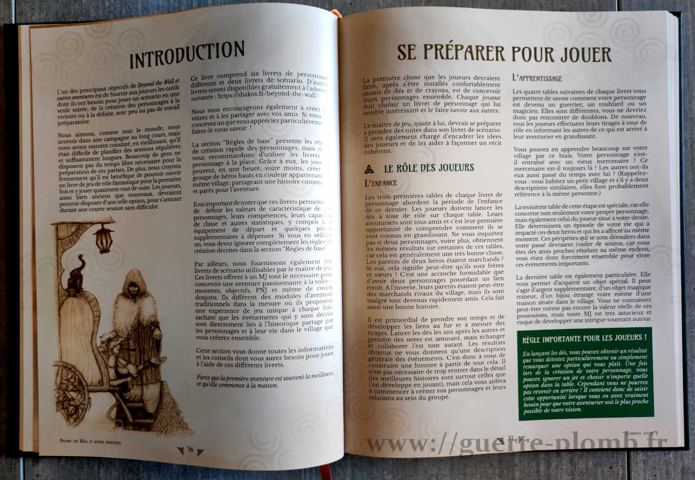 Bien que les règles de base de Beyond the Wall soient similaires à celles de nombreux autres jeux basés sur le jeu de rôle le plus populaire au monde, elles offrent quelque chose qu’ils ne proposent pas : des outils pour jouer presque immédiatement et quasiment sans préparation. En utilisant les livrets de personnage et de scénario, un groupe de joueurs avec un maître de jeu devrait pouvoir se lancer à l’aventure avec une préparation absolument nulle, pour une session d’environ trois à cinq heures, de la création des personnages à la célébration d’un succès glorieux ou la désillusion d’une défaite amère.