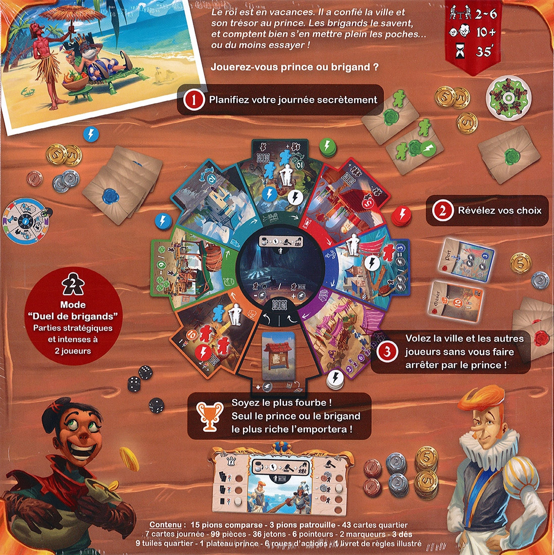 À chaque tour, les joueurs envoient leurs équipes dans les quartiers de leur choix. Le choix est secret et simultané. Lorsque tout le monde a pris sa décision, on révèle les choix de chacun et place tous les pions dans la ville, au centre de la table. Si une patrouille du prince est sur le même quartier que des comparses, les brigands sont arrêtés. Sinon, ils pourront piller le quartier. Chaque quartier permet de piller le trésor de manière unique. Attention, si quelqu’un a joué un jeton action sur le quartier au début de son tour, il pourra voler ou pousser l’équipe d’un autre joueur, ou peut-être courir vers un autre quartier au dernier moment. Une fois en prison, les brigands peuvent choisir d’attendre leur procès ou de tenter de s’évader.