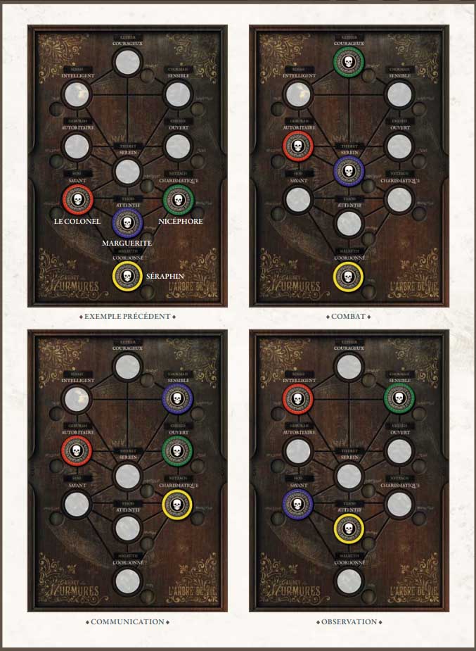 Une partie du Cabinet des Murmures a recours aux accessoires traditionnels du jeu de rôle auxquels s’ajoute une représentation de l’Arbre de vie sur laquelle les joueurs indiquent l’influence de leurs Esprits sur le médium qu’ils occupent ensemble. C’est la raison pour laquelle un poster est proposé avec le jeu.