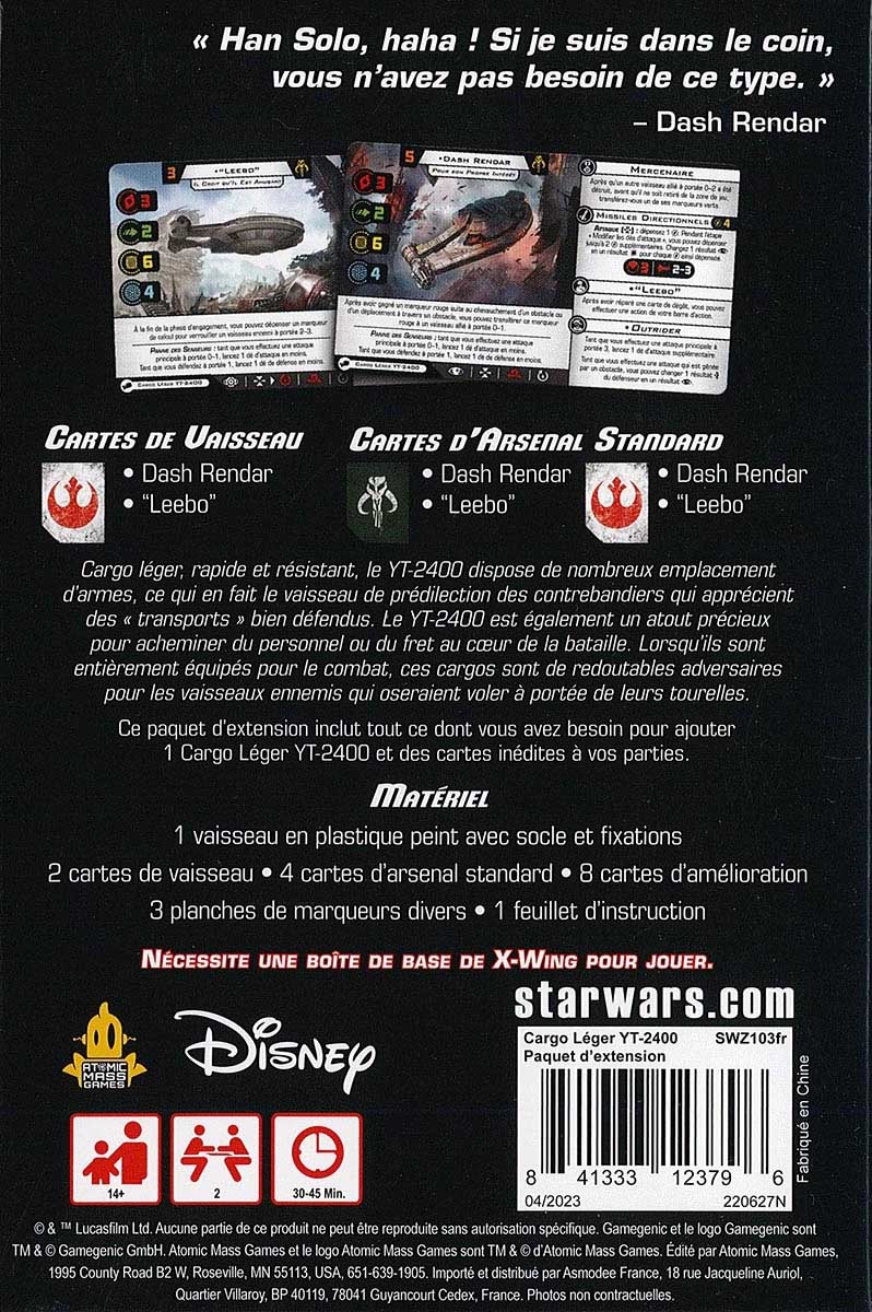 Ce pack ajoute l’un de ces vaisseaux à la collection des joueurs, ainsi que de nouvelles cartes de vaisseau pour le héros rebelle Dash Rendar et son compagnon droïde Leebo. Ces deux pilotes sont accompagnés de deux cartes de déploiement qui donnent aux joueurs tout ce dont ils ont besoin pour passer à l’action et de la réimpression de 8 cartes d’amélioration qui invitent les joueurs à équiper leur YT-2400 en fonction de leurs spécifications.