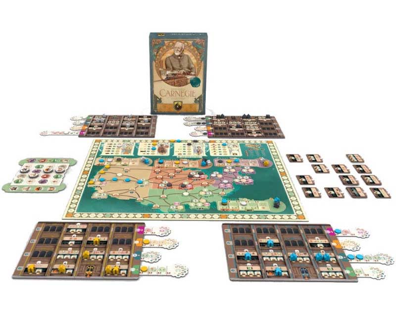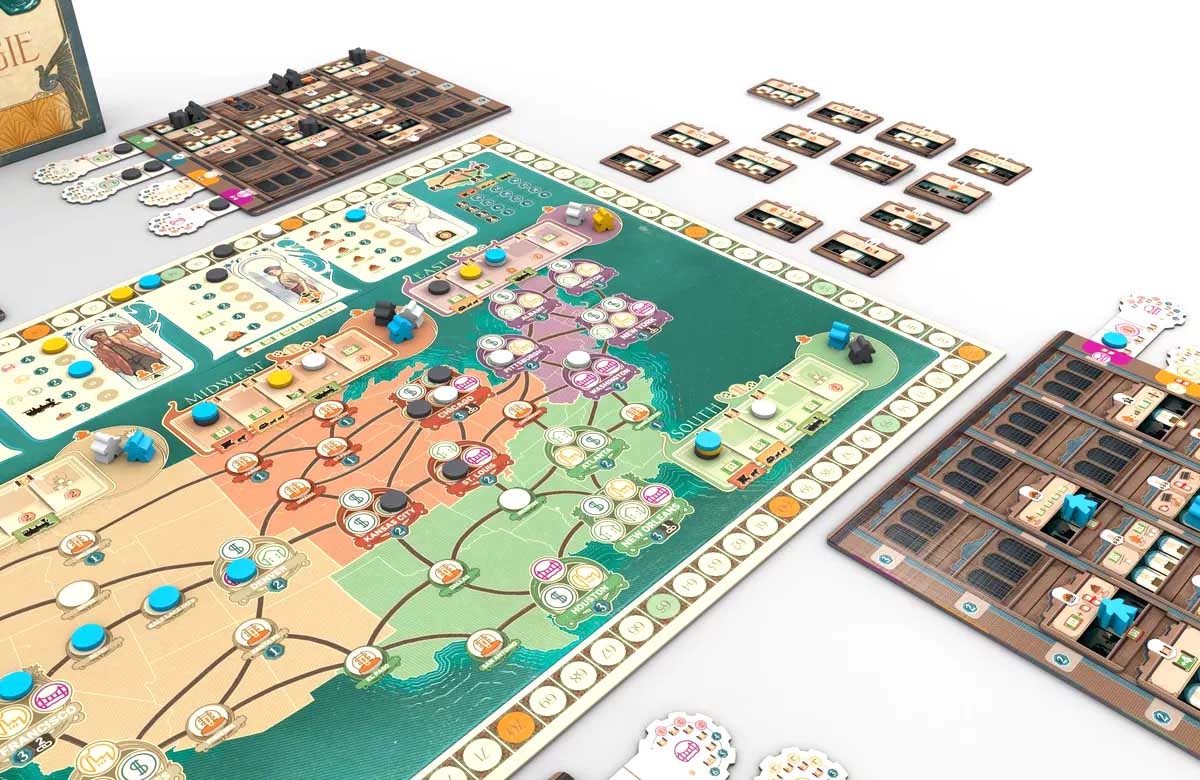 Matériel: 1 plateau principal (représentant une carte des États-Unis, divisés en quatre régions) – 4 plateaux Société – 60 pions Employé (15 par joueur) – 120 disques Joueur (30 par joueur) – 45 cubes Marchandise (40 de valeur 1, 5 de valeur 5) – 90 jetons Billet (40x$1, 30x$5, 20x$10) – 8 tuiles Chronologie – 4 tuiles Choix d’Action – 1 tuile Début et 1 tuile Fin (pour encadrer les tuiles Chronologie) – 32 tuiles Département (2 pour chacun des 16 Départements différents) – 45 cartes Solo (40 cartes Action et 5 cartes Points de Victoire) – 16 languettes Projet (recto verso, 4 par joueur) – 4 marqueurs Action – 1 marqueur Chronologie – 1 marqueur Premier Joueur – 4 aides de jeu – règles du jeu