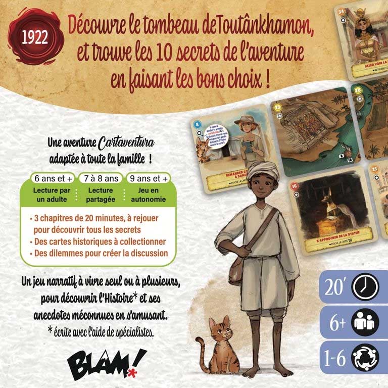Tu habites près de la Vallée des rois, là où sont enterrés les pharaons de l’Égypte antique. Un jour, l’opportunité de participer aux fouilles de la tombe de Toutânkhamon se présente, alors tu n’hésites pas ! Grâce à toi, une entrée est enfin découverte.