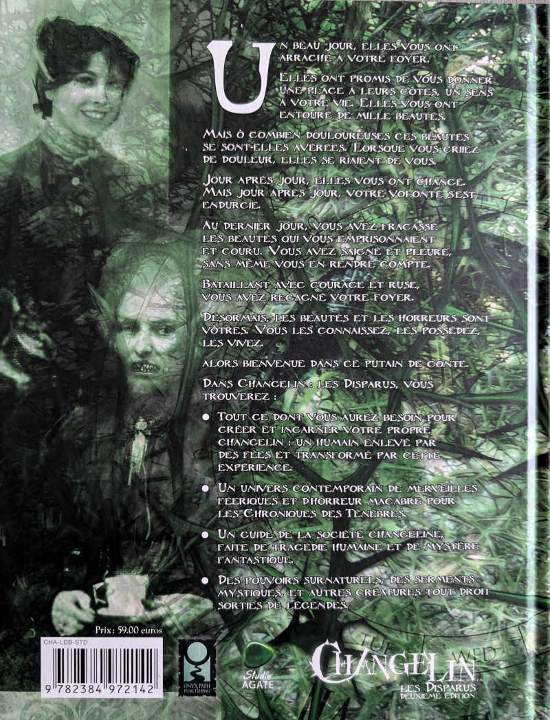 À vous de reconstruire votre vie, qui ne sera plus jamais la même. Changelin est un jeu devenu culte aux USA grâce à ses thèmes profonds, et le Studio Agate est fier de traduire sa deuxième édition. L’univers et les règles sont compatibles avec Démon : la Damnation et Vampire : le Requiem, deuxième édition. Le livre de règles et d’univers de Changelin : les Disparus contient tout ce qu’il faut pour jouer : la présentation de l’univers, une boite à outils pour concevoir son changelin préféré, des cours des saisons, mais aussi les règles de base et tous les pouvoirs.