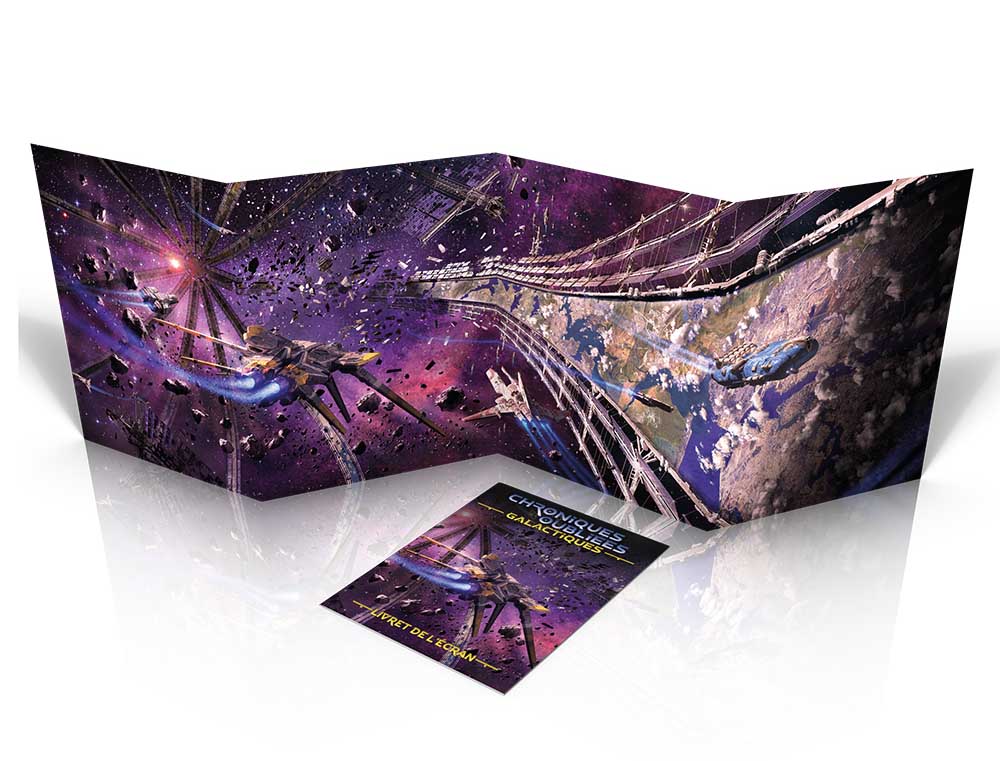 L’Écran du MJ est l’outil indispensable du meneur de jeu de Chroniques OubliéesTM Galactiques : ses quatre volets en mode portrait contiennent une synthèse des règles et toutes les tables qui seront utiles au MJ durant ses parties. De leur côté, les joueurs pourront admirer une vue de la gigantesque station Omega qui les plongera dans l’ambiance du jeu.