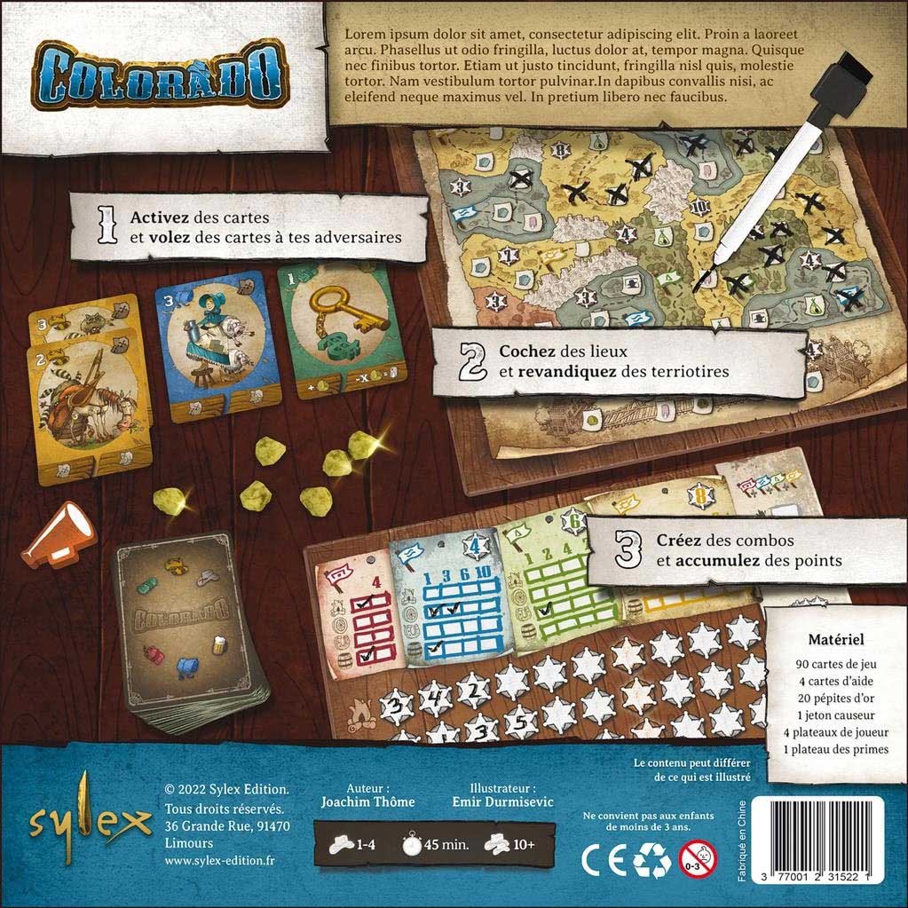 Matériel: 78 cartes de jeux, 4 cartes d’aide de jeu, 20 pépites d’or, 1 jeton Causeur, 4 feutres effaçables, 4 feuilles de route, 1 tableau des primes, 1 livret de règles.