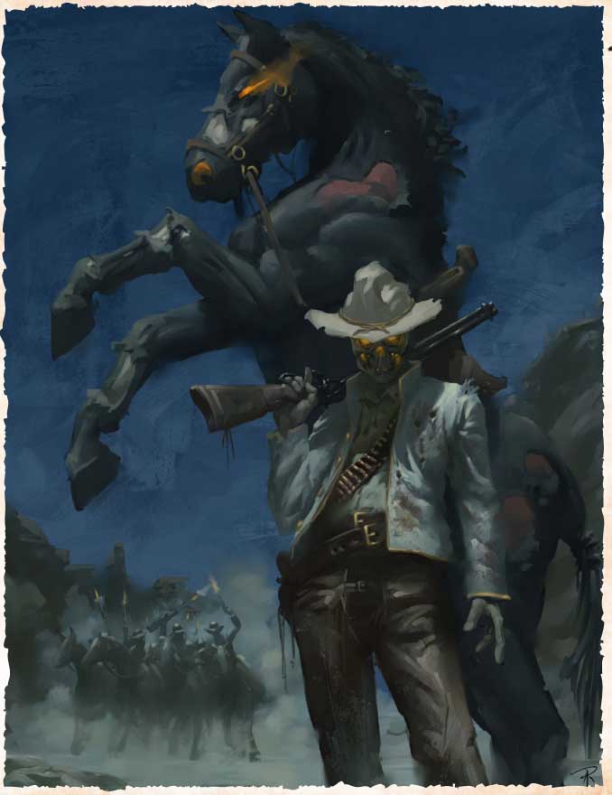 En plus de ces options de jeu supplémentaires, on a ajouté quelques conseils sur la manière de mener tes parties et un résumé des grandes intrigues des campagnes qui ont façonné le visage actuel de l’Ouest étrange. On s’est fendu d’un chapitre sur les Terres de chasse et comment y dérouler tes aventures, et d’un autre sur les racailles célèbres. Pour conclure, tu trouveras dans « Le Mangeur de cheval » de quoi raconter une histoire à glacer le sang de tes muchachos.