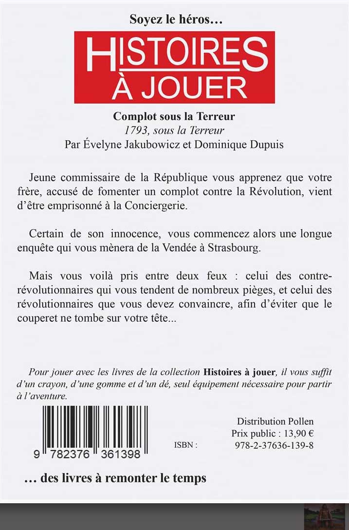Titre: COMPLOT SOUS LA TERREUR Titre original: id. (Presse Pocket – 1987) Œuvre: HISTOIRES À JOUER Type: Livre-Jeu Rédaction: Évelyne Jakubowicz, Dominique Dupuis Illustrationde couverture: : Marcel Laverdet Illustrations intérieures: Richard Peyzaret Matériel: livre de 220 pages N&B au format poche à couverture souple Edition: POSIDONIA EDITIONS(PLUMIER DES CHIMÈRES) ISBN: 978-2376361398 (mars 2023) Prix moyen constaté: 13,90€