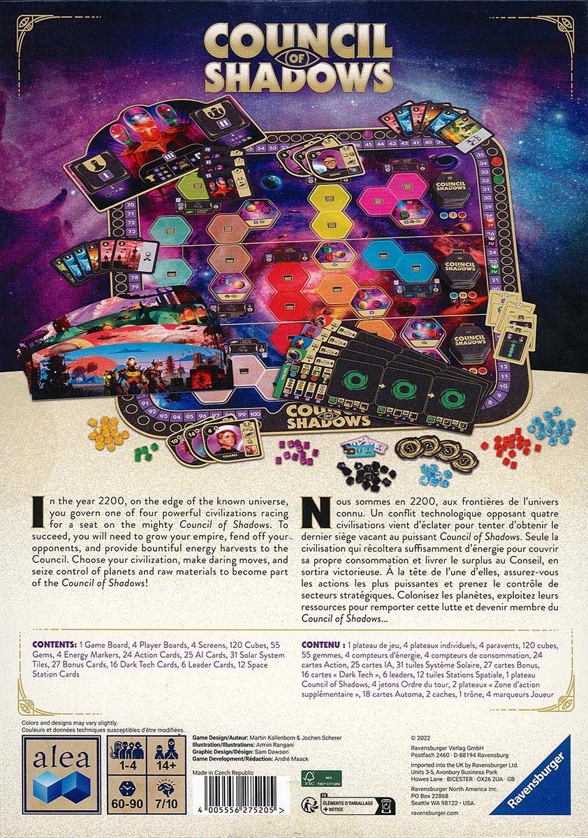 Matériel: 1 plateau de jeu double-face, 1 plateau Council of Shadows, 31 tuiles Système Solaire, 4 jetons Ordre du tour, 2 plateaux « Zone d’action supplémentaire », 25 cartes « Intelligence Artificielle », 16 cartes « Dark Tech », 27 cartes Bonus, 18 cartes Automa, 55 gemmes, 2 caches, 6 leaders, 1 trône, 24 cartes Action de départ, 4 paravent, 3 tuiles Station Spatiale, 4 plateau individuel, 4 marqueur Joueur, 4 compteur d’énergie, 4 compteur de consommation, 120 cubes, , 1 livret de règles.