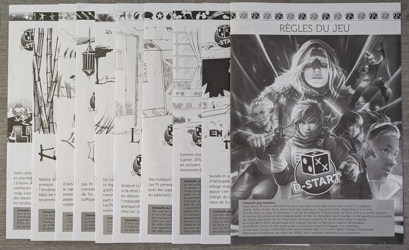 Découvrez le premier jeu de rôle intégralement prêt à jouer en une heure. Que vous soyez un débutant ou un rôliste confirmé, D-Start permet aux joueurs de se lancer dans une aventure haletante à l’ouverture de la boîte ! Les 10 scénarios proposés permettent de se plonger dans des univers variés parmi les plus renommés de la pop culture.
