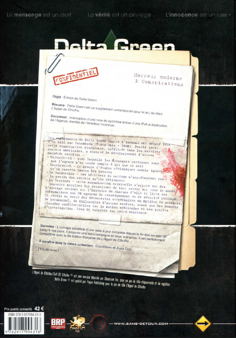 Les engagements de Delta Green contre l’inconnu ont débuté lors d’un raid sur Innsmouth (États-Unis – 1928). Depuis lors, cette organisation dissidente, infiltrée dans les services secrets américains, a observé le développement d’autres sociétés secrètes: