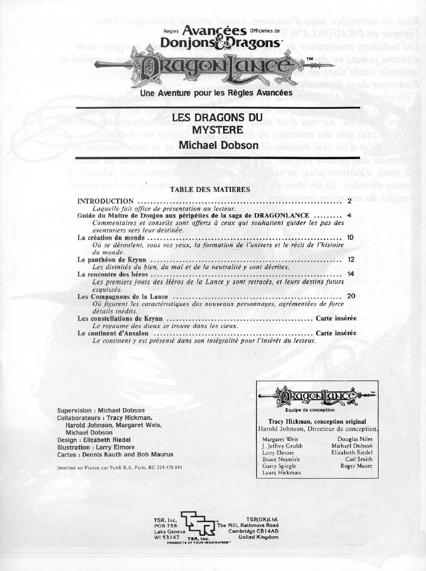 Création et Rédaction: Tracy Hickman, Michael Dobson, Harold Johnson, Bruce Nesmith, Margaret Weis