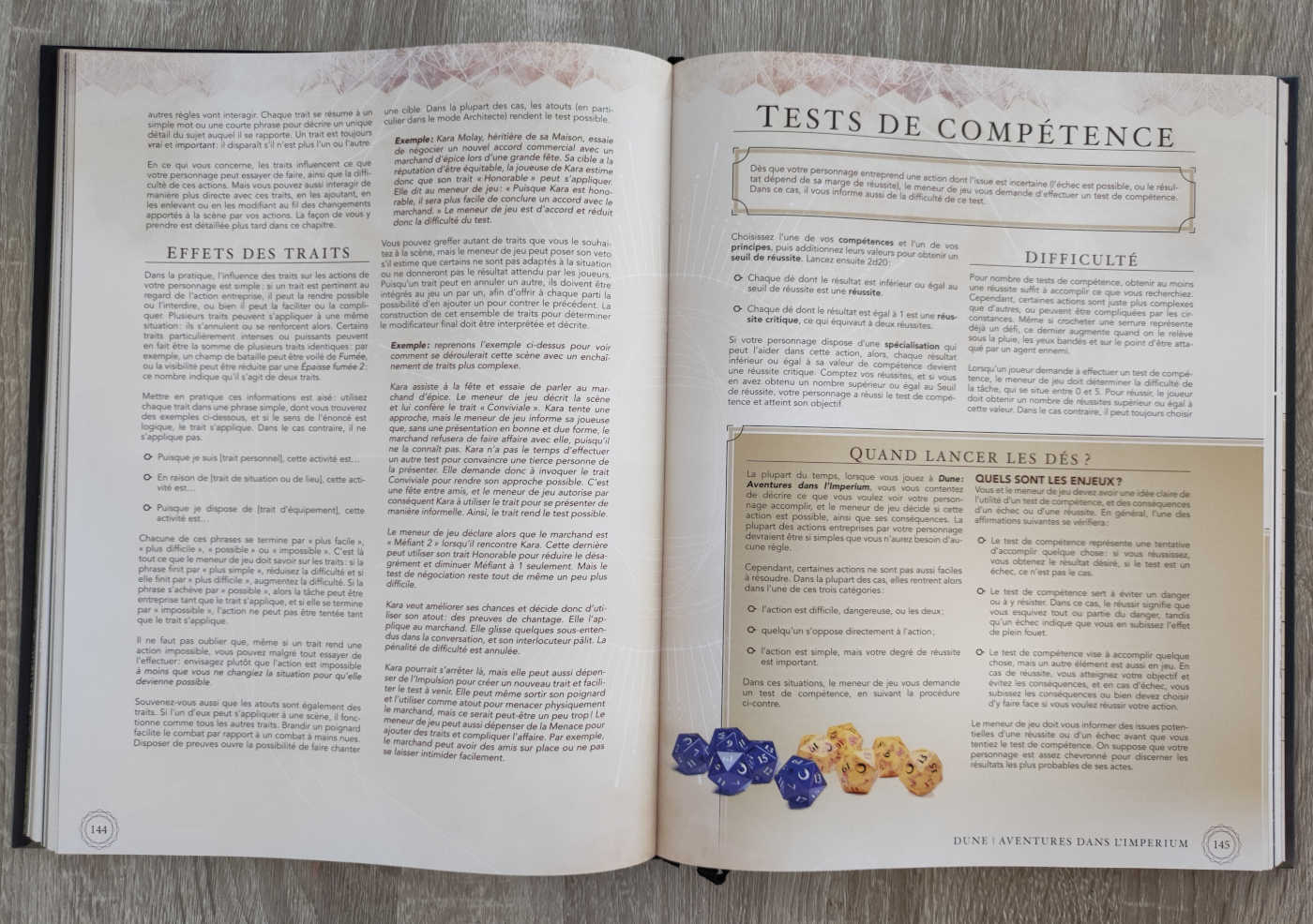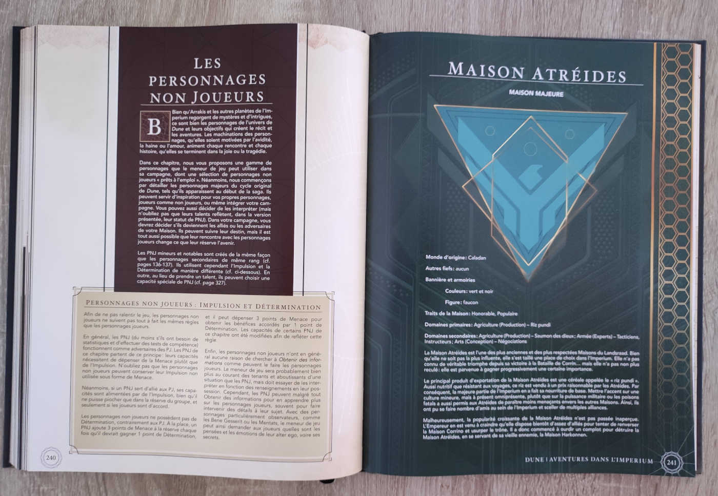 - Une nouvelle version du système 2d20 adaptée à l’univers de Dune et présentant des règles de création de votre Maison Noble, ainsi que le jeu des architectes, dans lequel vous devenez les marionnettistes et déplacez vos agents pour servir les intérêts de votre Maison.