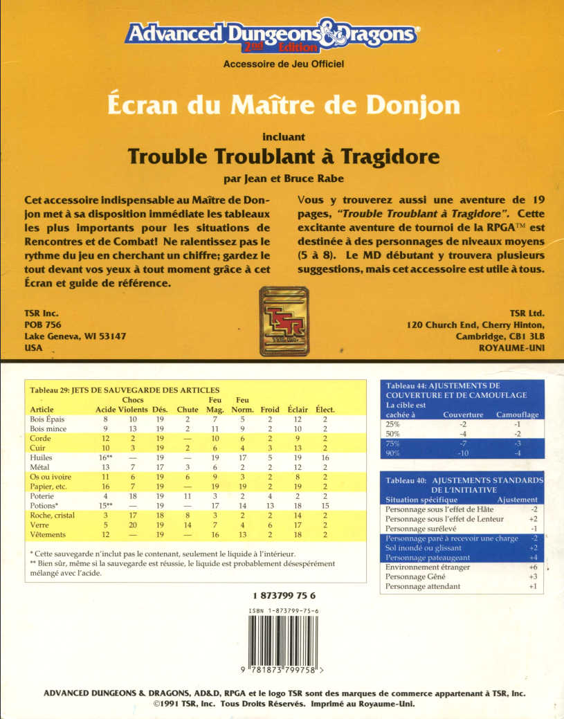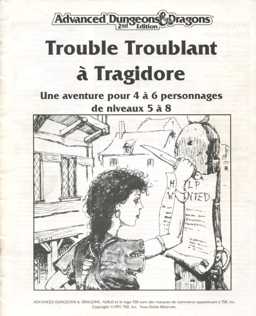 Vous y trouverez aussi une aventure de 19 pages, « Trouble troublant à Tragidore ». cette excitante aventure de tournoi de la RPGA™ est destinée à des personnages de niveaux moyens (5 à 8). Le MD débutant y trouvera plusieurs suggestions, mais cet accessoire est utile à tous.