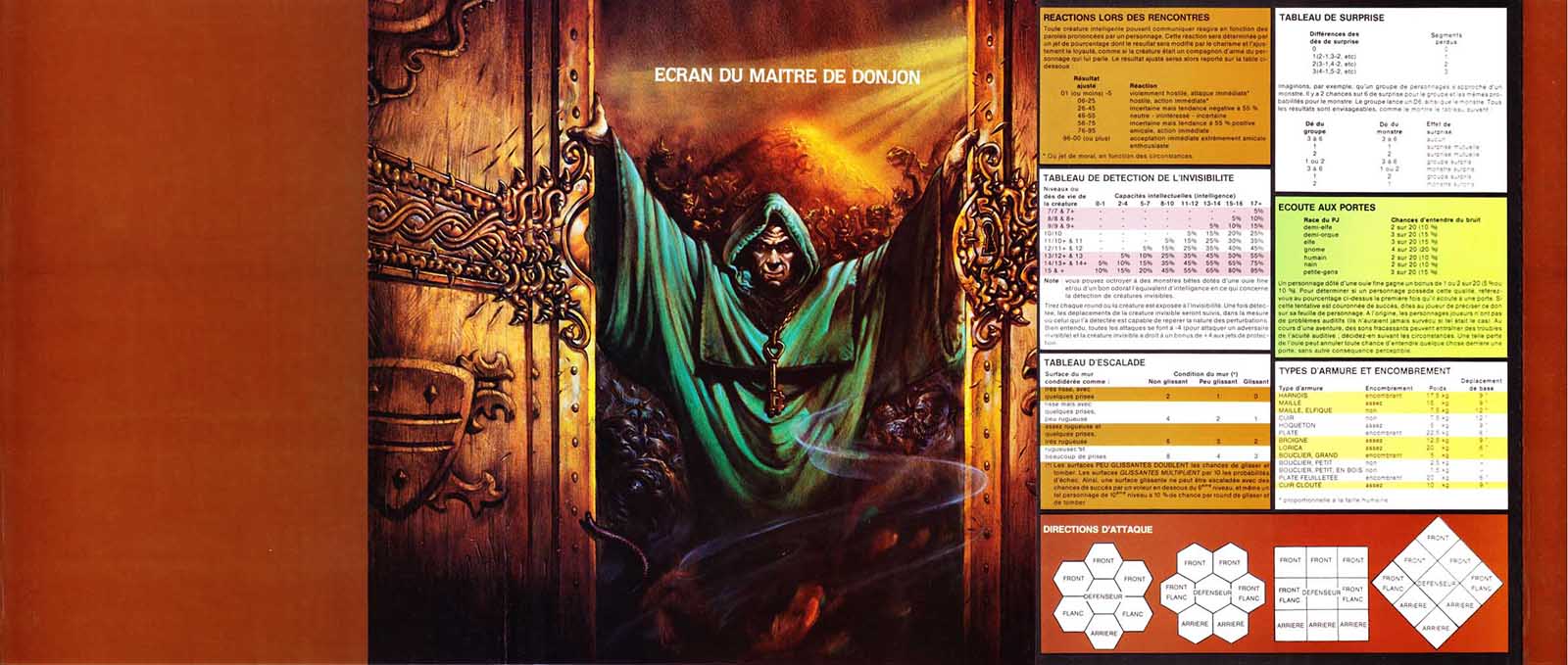 L’écran du Maître de Donjon est l’accessoire indispensable à la maîtrise d’une aventure AD&D. D’un seul coup d’œil il vous donne accès à l’ensemble des tables et chartes permettant de régler toutes les situations de jeu possibles.