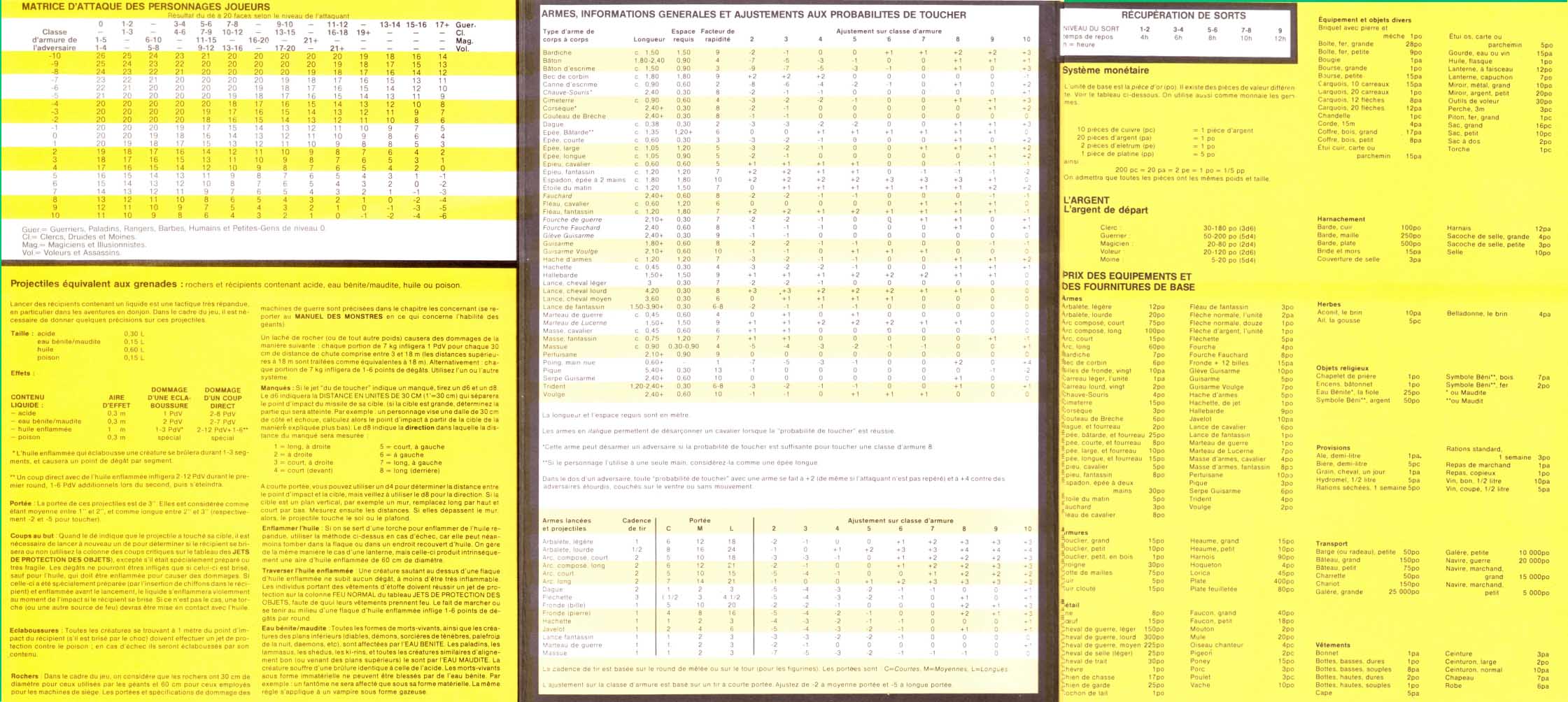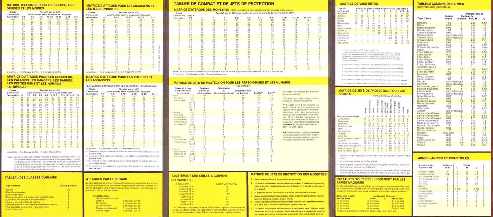 Il comprend deux écrans avec les tableaux d’armes de combats, de jets de protection et d’équipements ainsi qu’une double page rappelant les caractéristiques et facultés propres à chaque type de personnages.