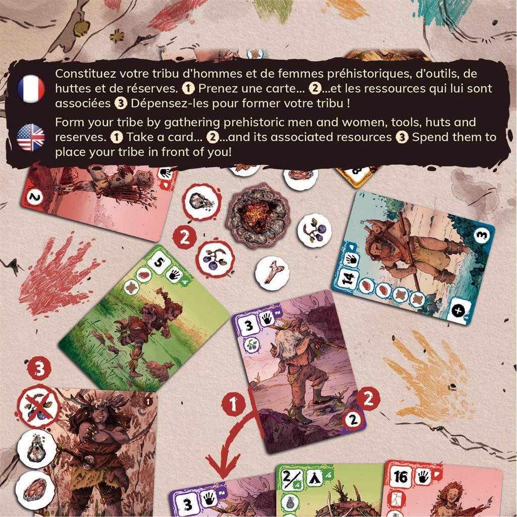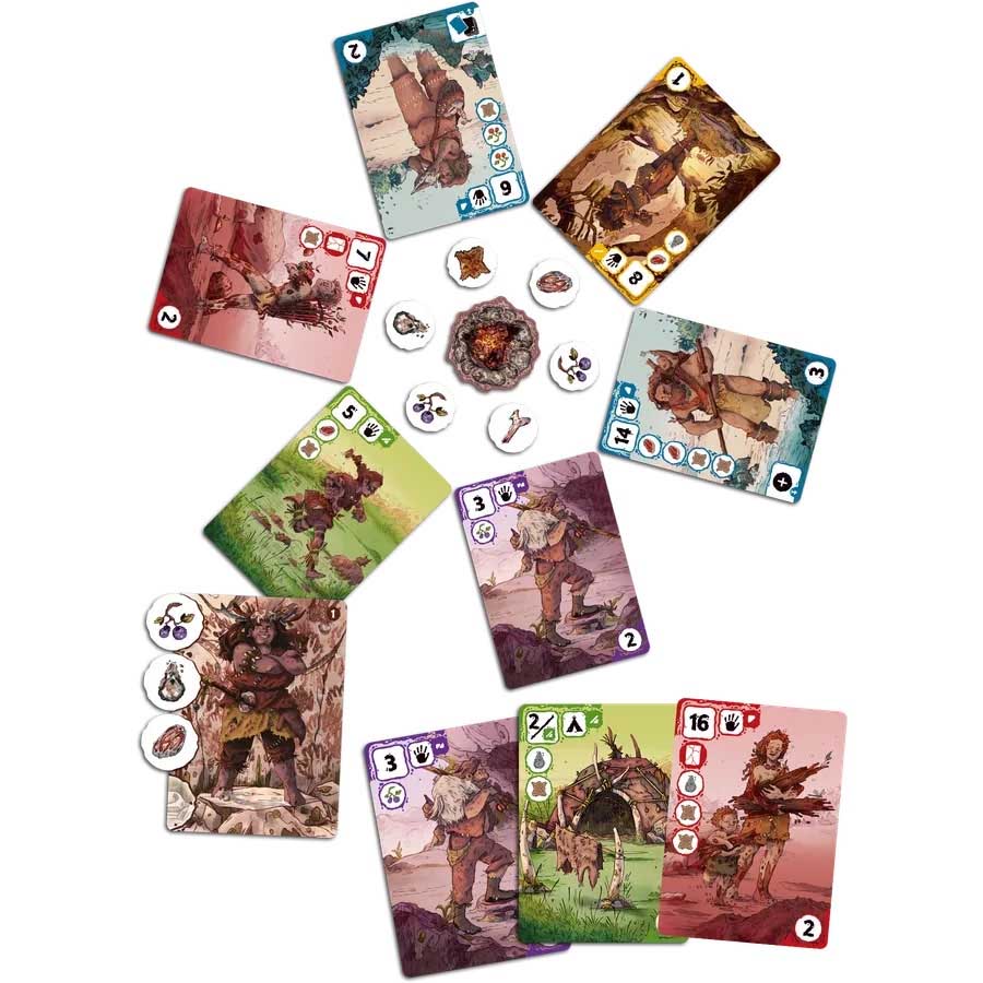 Dans le jeu Elawa, vous devez former votre tribu en posant devant vous des cartes hommes et femmes préhistoriques, outils, huttes et réserves.