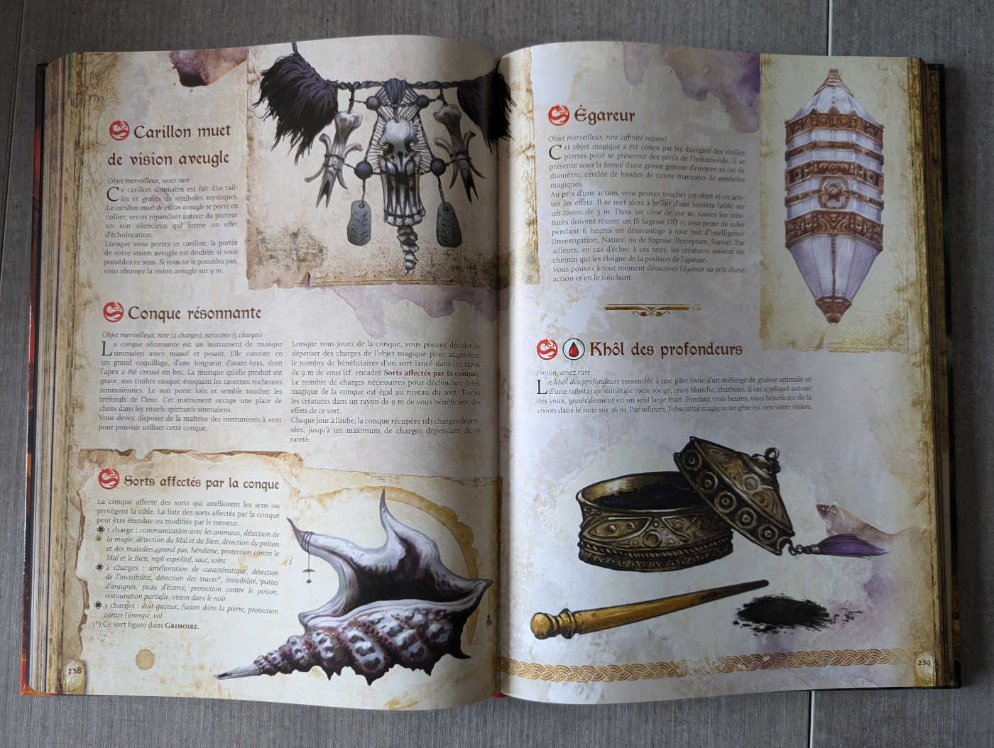 Enrichir la campagne. Plus de 120 objets magiques sont présentés, dont les terribles blasphèmes, imprégnés de l’énergie délétère du Chancre. Des glyphes permettent de modifier les particularités d’une région souterraine. Des aides de jeu offrent de nouvelles options pour la création et l’évolution des aventuriers.