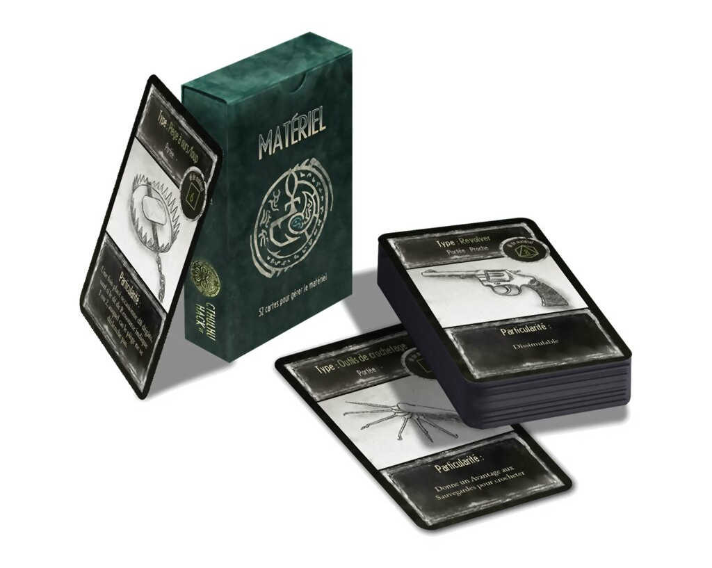 Les cartes Équipement matérialisent les armes, accessoires et outils présentés dans le livre de base de Cthulhu Hack.