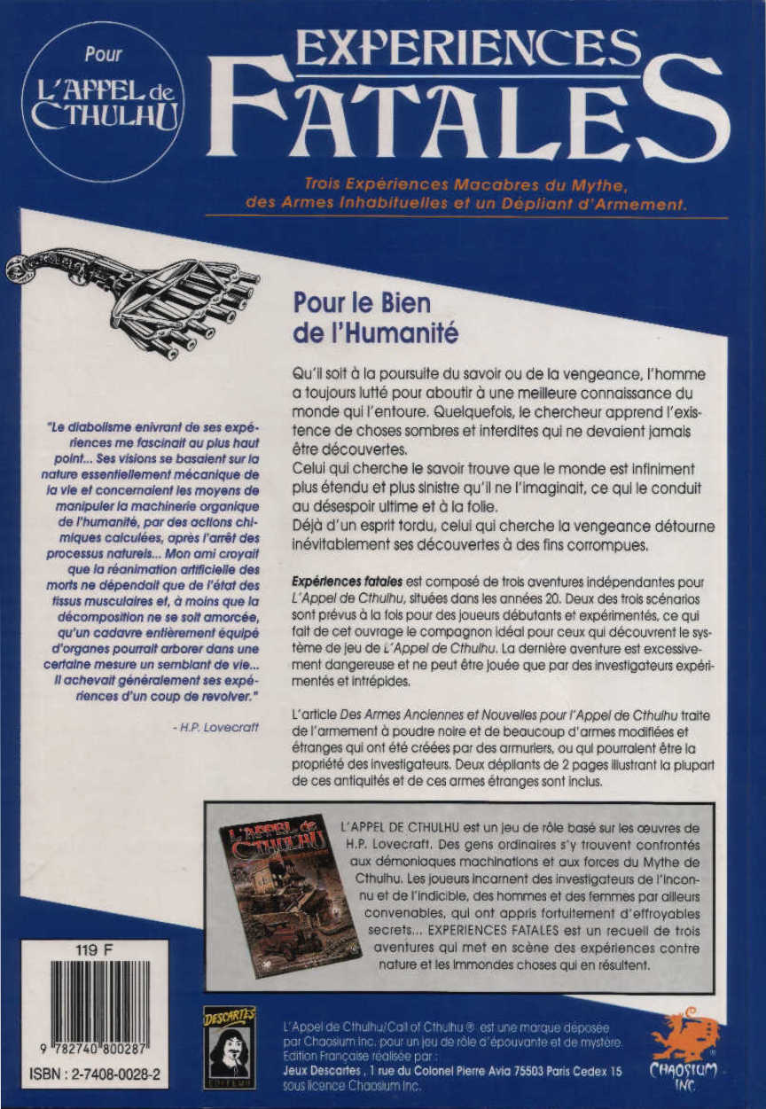 Titre original: Fatal Experiments (Chaosium – 1990)