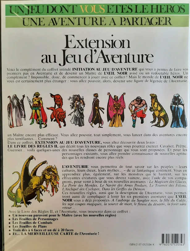 Voici le complément du coffret intitulé INITIATION AU JEU D’AVENTURE qui vous a permis de faire vos premiers pas en Aventurie et de devenir un Maître de L’ŒIL NOIR avisé ou un redoutable héros. Un complément? Impossible, donc, de commencer à jouer avec ce coffret! Mais le monde de L’ŒIL NOIR ne vous est certainement plus étranger: vous allez pouvoir, alors, devenir une figure légendaire de l’Aventurie, un Maître encore plus efficace. Vous allez pouvoir, tout simplement, vous lancer dans des aventures encore plus terrifiantes… Comment?