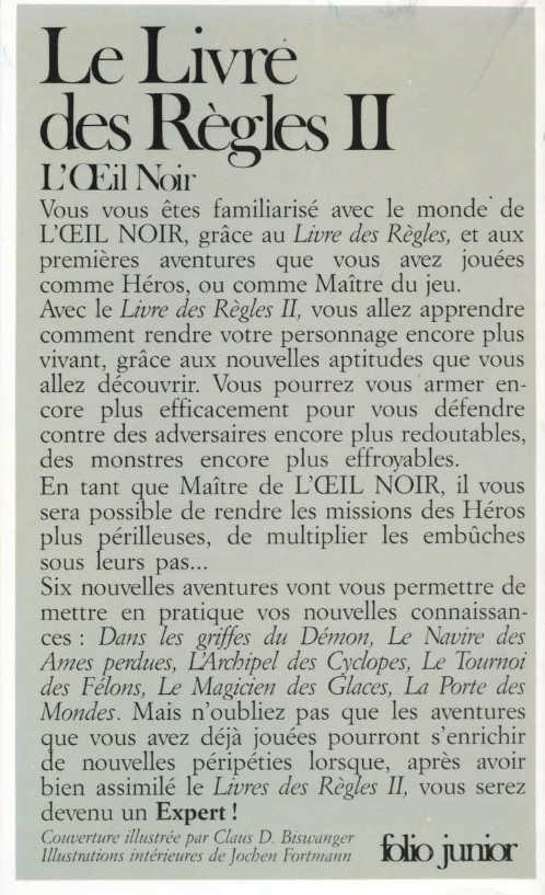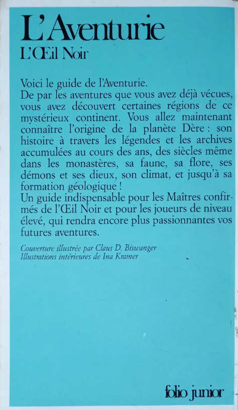 Ces nouvelles règles, ainsi que la description de l’Aventurie, vous permettront aussi de compliquer à loisir les six premières aventures que L’ŒIL NOIR vous a déjà proposées: A l’Auberge du Sanglier Noir, La Fille du Calife, Les Sept Coupes Magiques, La Source de Mort, Le Fleuve du Désastre, La Forêt sans Retour.
