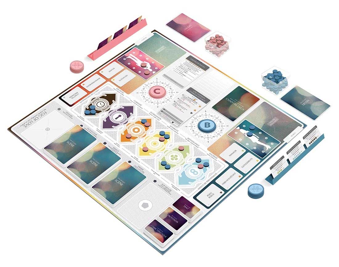Matériel: 1 plateau, 2 cartes Personnage, 2 porte-cartes, 18 intercalaires, 1 insert de rangement, 110 cartes Scène, 4 Histoire d’amour, 14 cartes Destin, 38 cartes Trait, 36 cartes Profession, 60 cartes Caractéristique, 30 cartes Tutoriel, 8 jetons Choix, 70 jetons de Personnalité, 2 boîtes de rangement, livret de règles.