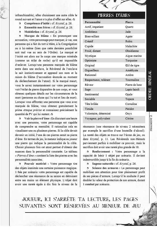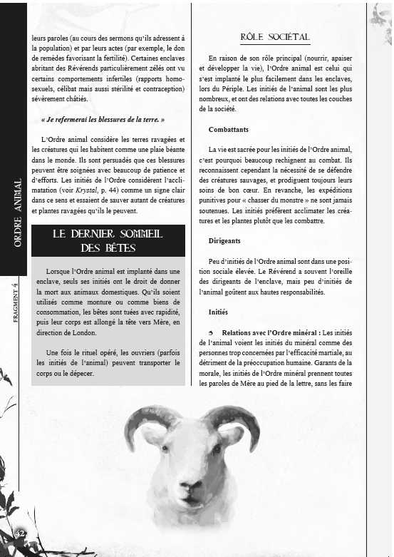 L’Ordre minéral, l’Ordre végétal et l’Ordre animal : pour chacun sont détaillés les croyances, le rôle dans la société, les cérémonies et la symbolique, et pour le meneur de jeu des intrigues et secrets ;