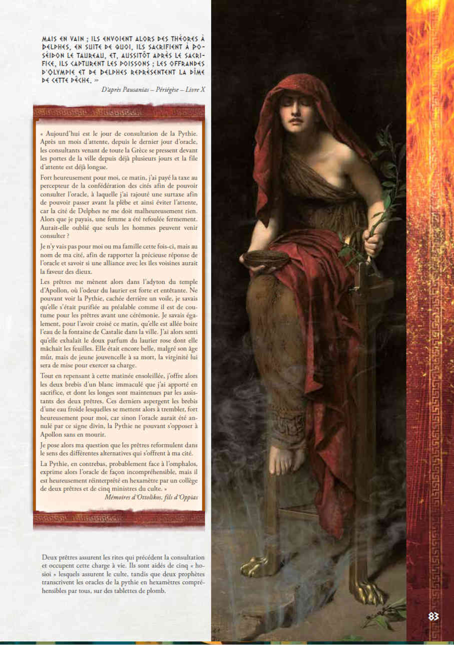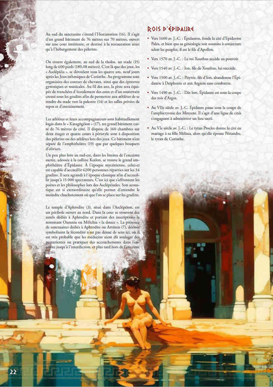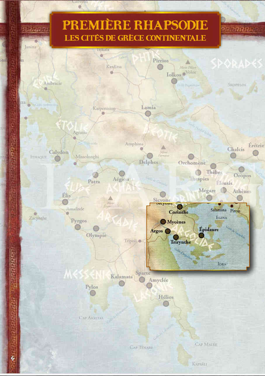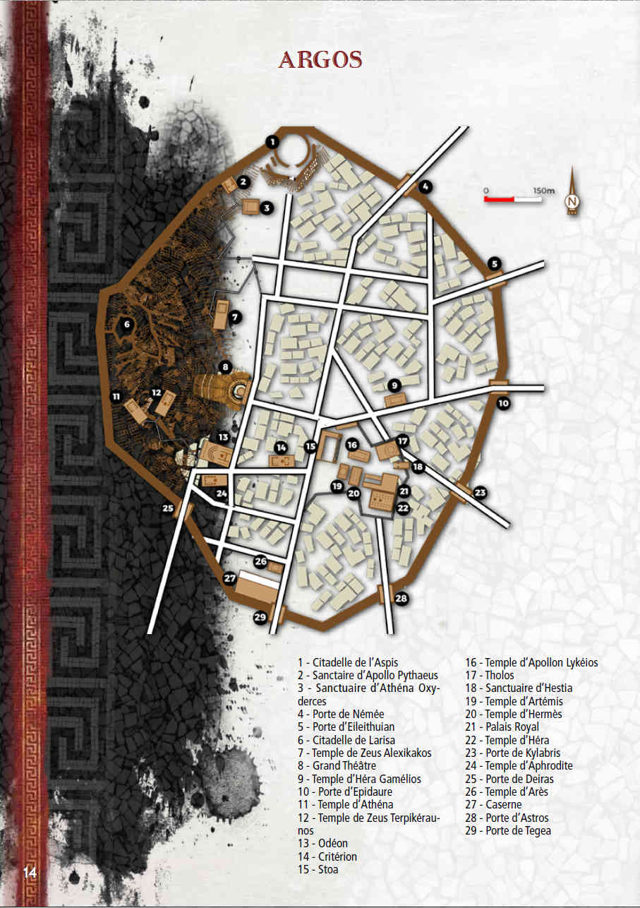 Dans ce supplément, vous trouverez les descriptions de cités parmi les plus importantes de la Grèce mycénienne, avec de nombreux plans archéologiques, mais d’époques plus tardives, car les constructions mycéniennes étaient plus souvent faites de bois que de pierres, et notre imaginaire de la Grèce est plutôt axé sur l’architecture de l’époque classique avec ses temples de marbre. C’est donc volontairement sur cette époque classique, dont les ruines, décrites par Hérodote et Pausanias, et encore visibles aujourd’hui, constitueront la base de nos descriptions urbaines, plutôt que d’imaginer une urbanisation qui n’aurait jamais existé. Il faut aussi bien prendre en compte qu’avant la présence d’un temple en marbre, il a bien souvent eu auparavant un temple de bois, voire un simple autel de dévotion.