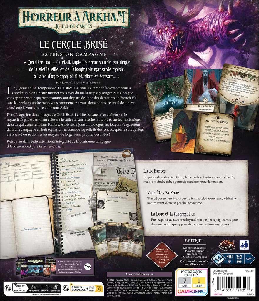 Dans l’extension de campagne Le Cercle Brisé, 1 à 4 investigateurs enquêtent sur le mystérieux passé d’Arkham et lèvent le voile sur son histoire macabre et sur les motivations de ceux qui y œuvrent dans l’ombre.