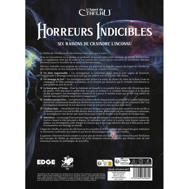 Horreurs Indicibles vous propose six scénarios qui glaceront le sang des joueurs de L’Appel de Cthulhu les plus chevronnés, en leur donnant de bonnes raisons de craindre l’inconnu.
