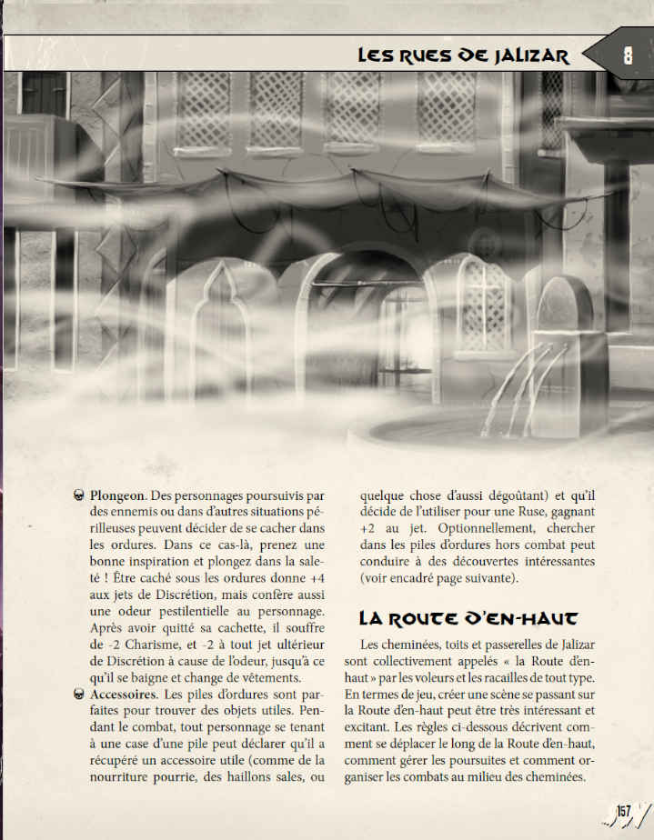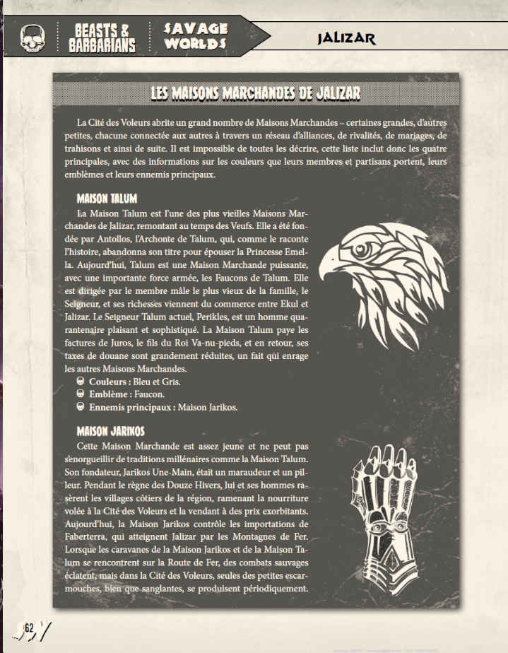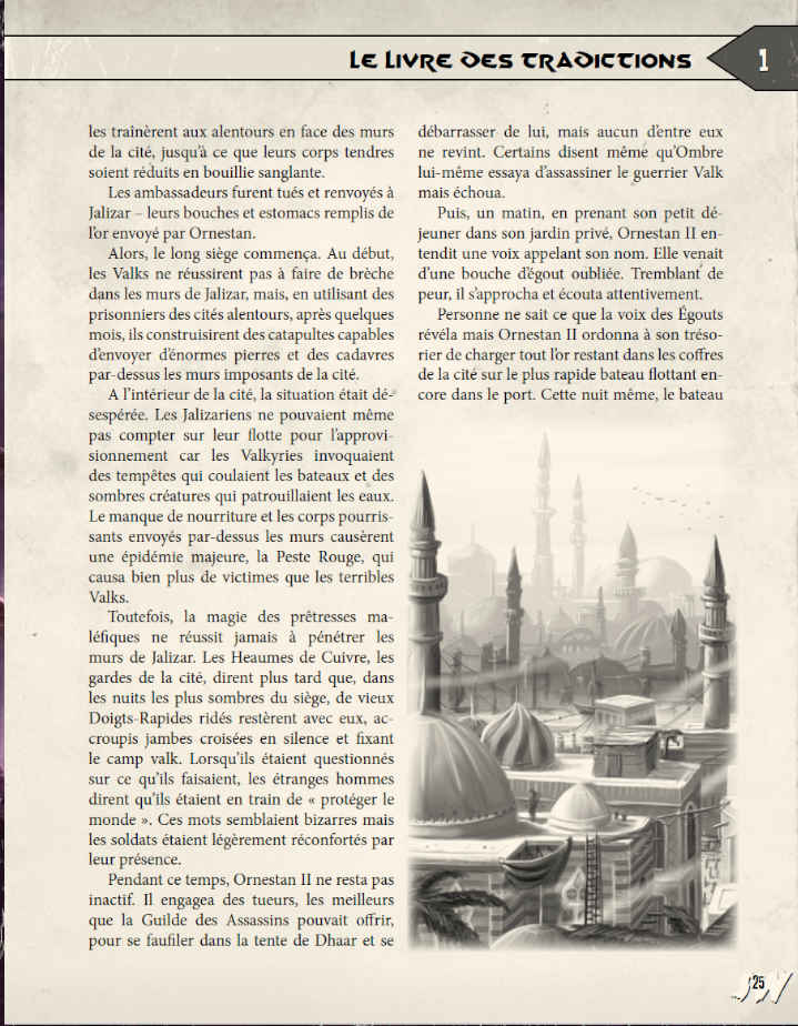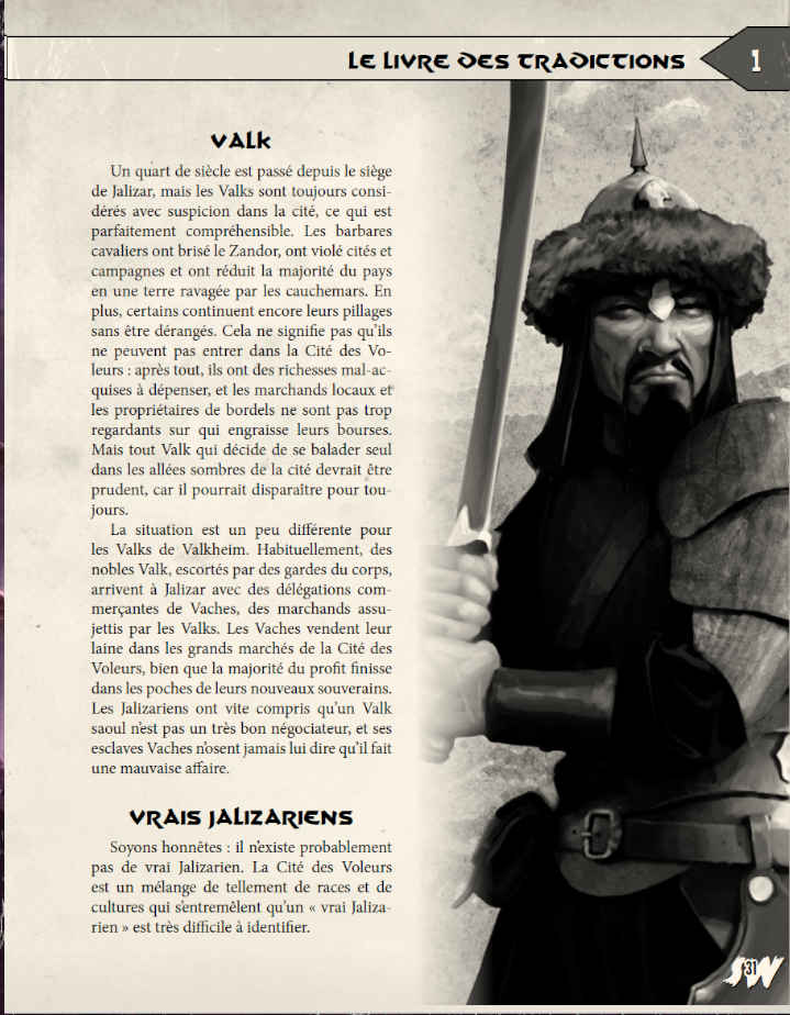 Ce livre est un recueil détaillé sur Jalizar, la plus grande cité du Zandor. C’est un endroit sombre et dangereux, rempli de corruption, intrigue et traîtrise. Ici, les puissantes maisons marchandes luttent contre des guildes criminelles louches pour le contrôle des grandes richesses amenées quotidiennement à l’intérieur des impressionnants murs anciens qui ont résisté à l’invasion Valk.