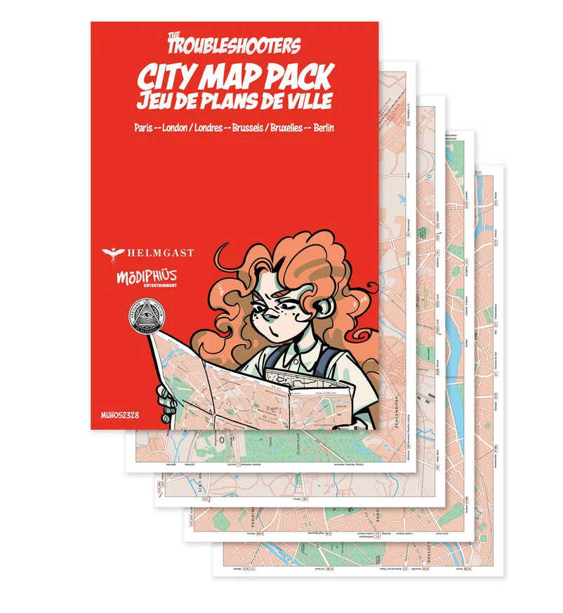 Cet ensemble d’accessoires pour le jeu de rôle The Troubleshooters contient quatre cartes détaillées des centres-villes de Paris, Londres, Berlin et Bruxelles, avec une carte du monde au verso.