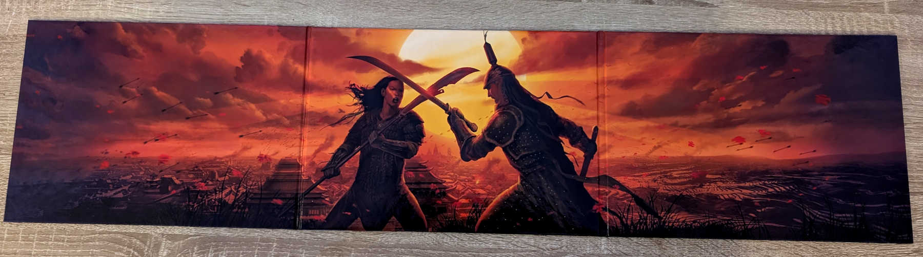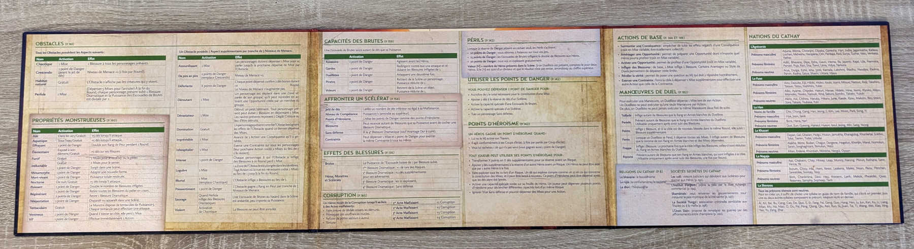 L’écran consiste en trois volets format paysage, en carton rigide couleur. Le recto figure une illustration de Johann “Yoz” Bodin, qui représente un duel au soleil couchant. Le verso comporte de nombreuses références et rappels utiles pour répondre aux idées foisonnantes des joueurs. Bien sûr, il s’agit d’une version adaptée au continent du Cathay et à ses dangers spécifiques.