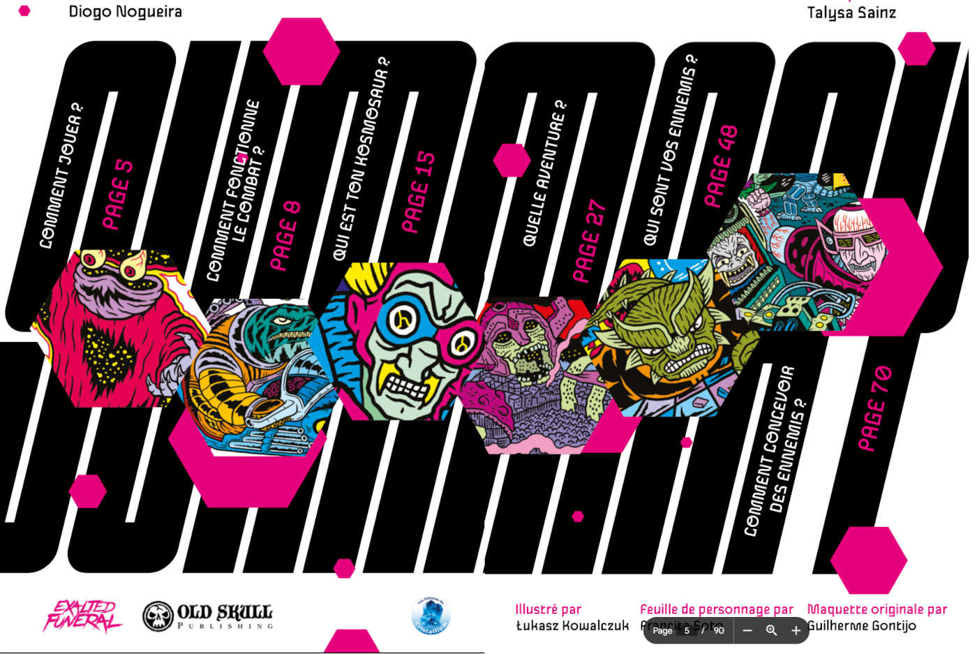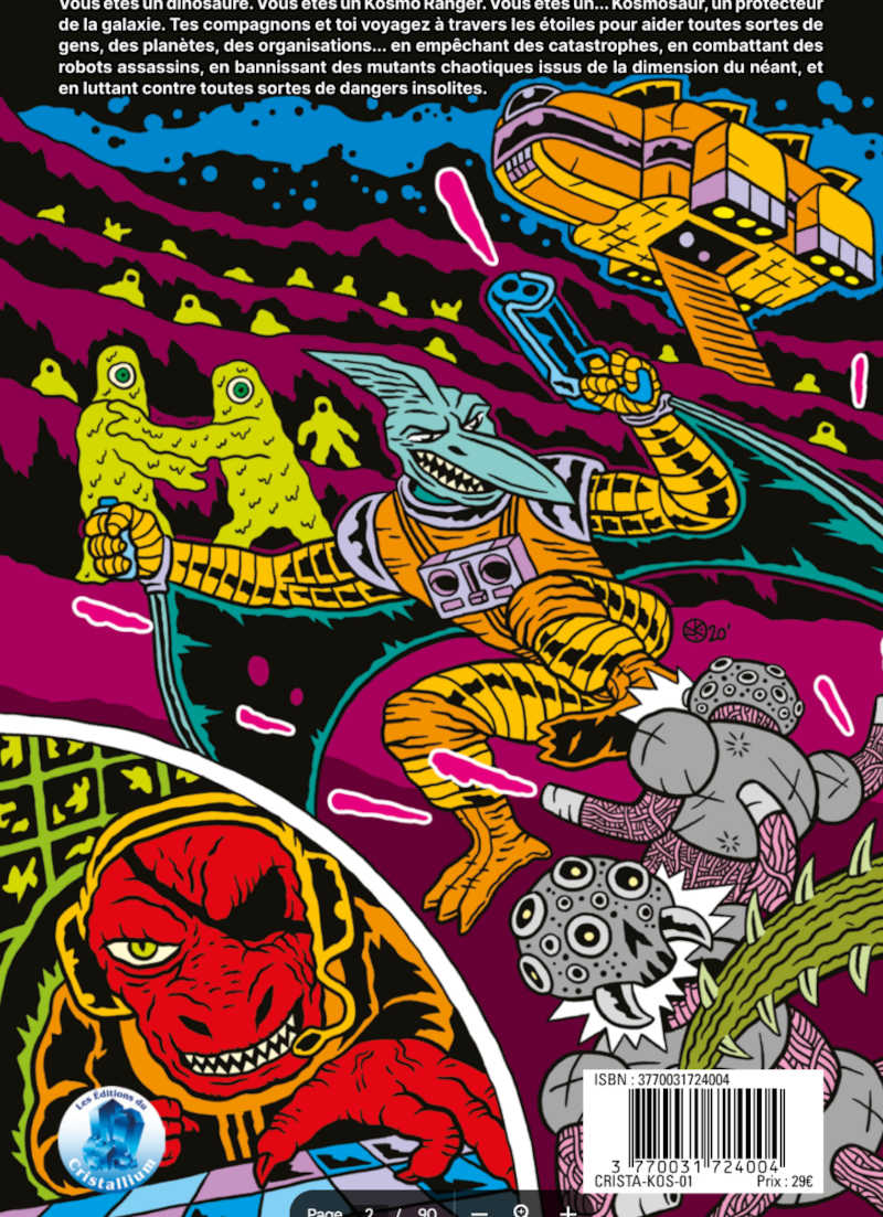 Kosmosaurs est ce que je classe comme un JDR d’apero. En 2 mn, on crée des dinosaures-anthopropmorphés justiciers et, dans un pur esprit pulp série Z, on se lance dans l’aventure. Des jets de 2D6 basiques avec des résultats hyper aléatoires, des effets dignes de StarCrash (sans, hélas, Caroline Munro)… On devine les pistolasers en forme de sèche-cheveux et les sabres laser en mousse. La traduction est parfois un peu hésitante (manque de relecture, mais un pdf rectif est mis à la dispo des acheteurs) et la mise en forme foutraque nécessite une petite gymnastique visuelle. Au final, Kosmosaurs ne casse pas trois pattes à un velociraptor mais cela promet quelques soirées rigolotes. – Nico