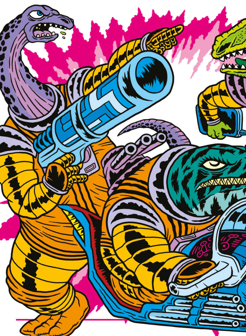 Ce jeu est pourvu d’un système qui se veut minimaliste, mais avec un très fort potentiel narratif. Il est principalement inspiré de 2 jeux de John Harper : Lasers & Feelings et Blades in the Dark. Et l’ambiance générale se veut très flashy années 80, et très inspirée des cartoons de science-fiction de ces années-là, particulièrement par l’excellente série Dinosaucers.