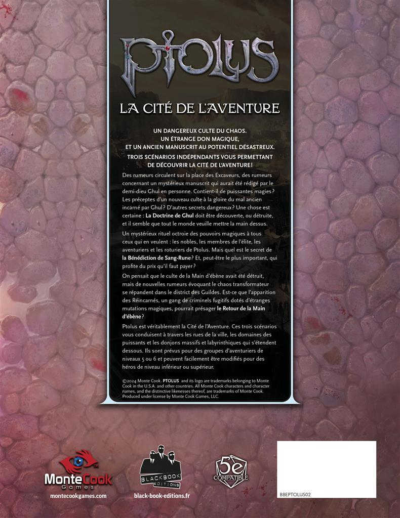 Ptolus est véritablement la Cité de l’Aventure. Ces trois scénarios vous conduisent à travers les rues de la ville, les domaines des puissants et les donjons massifs et labyrinthiques qui s’étendent dessous. Ils sont prévus pour des groupes d’aventuriers de niveaux 5 ou 6 et peuvent facilement être modifiés pour des héros de niveau inférieur ou supérieur.