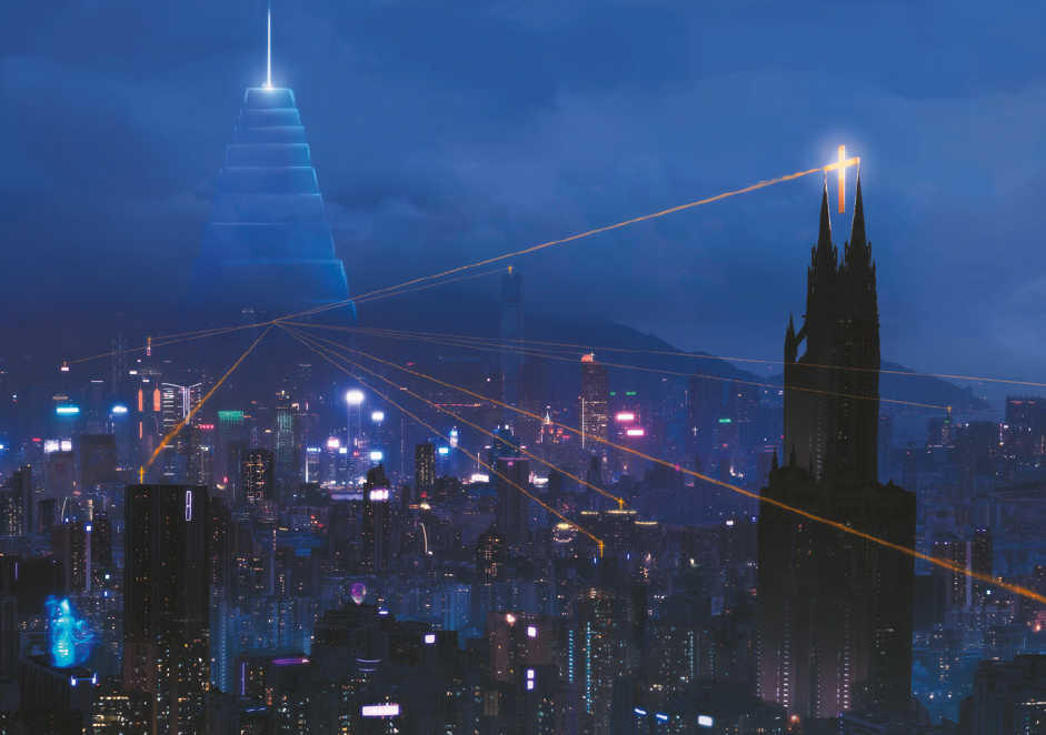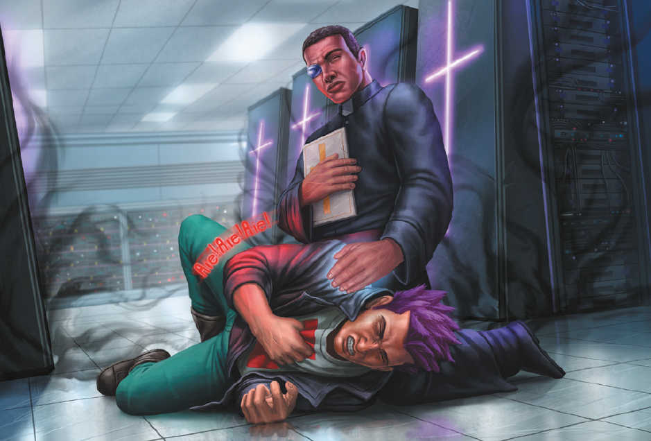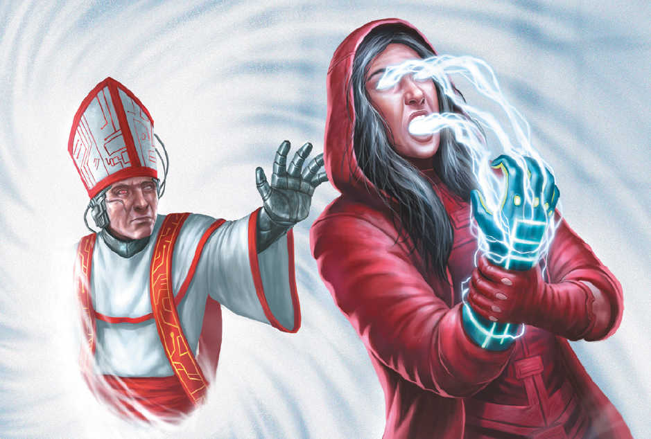 À l’intérieur des frontières de la Cyberpapauté, les gens prient à genoux, craignant les sorcières et les démons qui pourraient se cacher n’importe où. S’ils prient assez fort et suivent les règles, l’Église bienveillante peut améliorer leur chair fragile et imparfaite grâce à son élégante cybertechnologie.