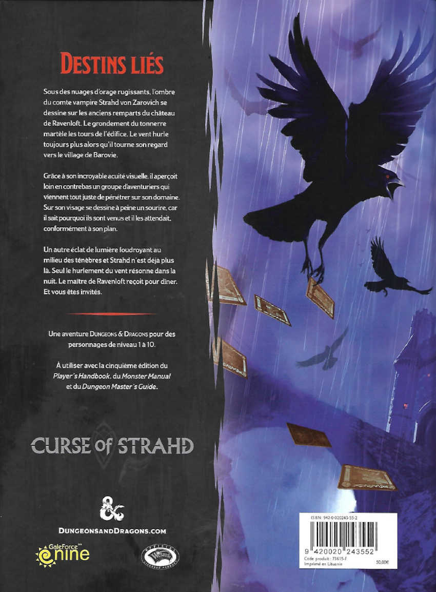 La Malédiction de Strahd est une aventure d’horreur fantastique pour des personnages de niveaux 1 à 10 et contient tout ce dont le maître du donjon a besoin pour créer une expérience de jeu passionnante et mémorable.