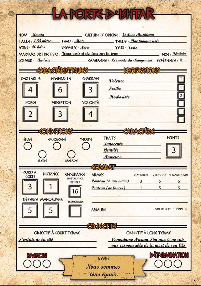 J’aime beaucoup la création de personnages, à travers six « archétypes », qu’il est préférable d’effectuer en collège. Le choix est assez varié, des nordistes Cimmérien aux Iridimu, des nomades à têtes de chacal vivant dans le sud. La génération de son avatar, qui dresse un portrait bien complet, donc assez long, encourage plus la mise en place de campagne que de simples soirées one-shot.