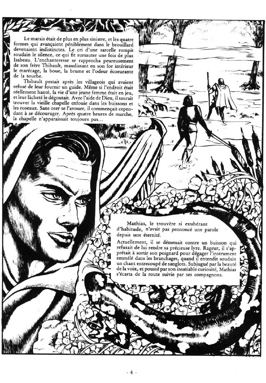 « Les deux armées s’observent encore. Merlin saisit alors le sifflet d’or qui ne le quitte jamais et en tire un sont strident. Le vent répond à son appel en balayant vers la plaine un immense tourbillon de poussière. Les chevaliers d’Arthur se jettent lances baissées sur leurs ennemis aveuglés dont ils font un grand carnage ».