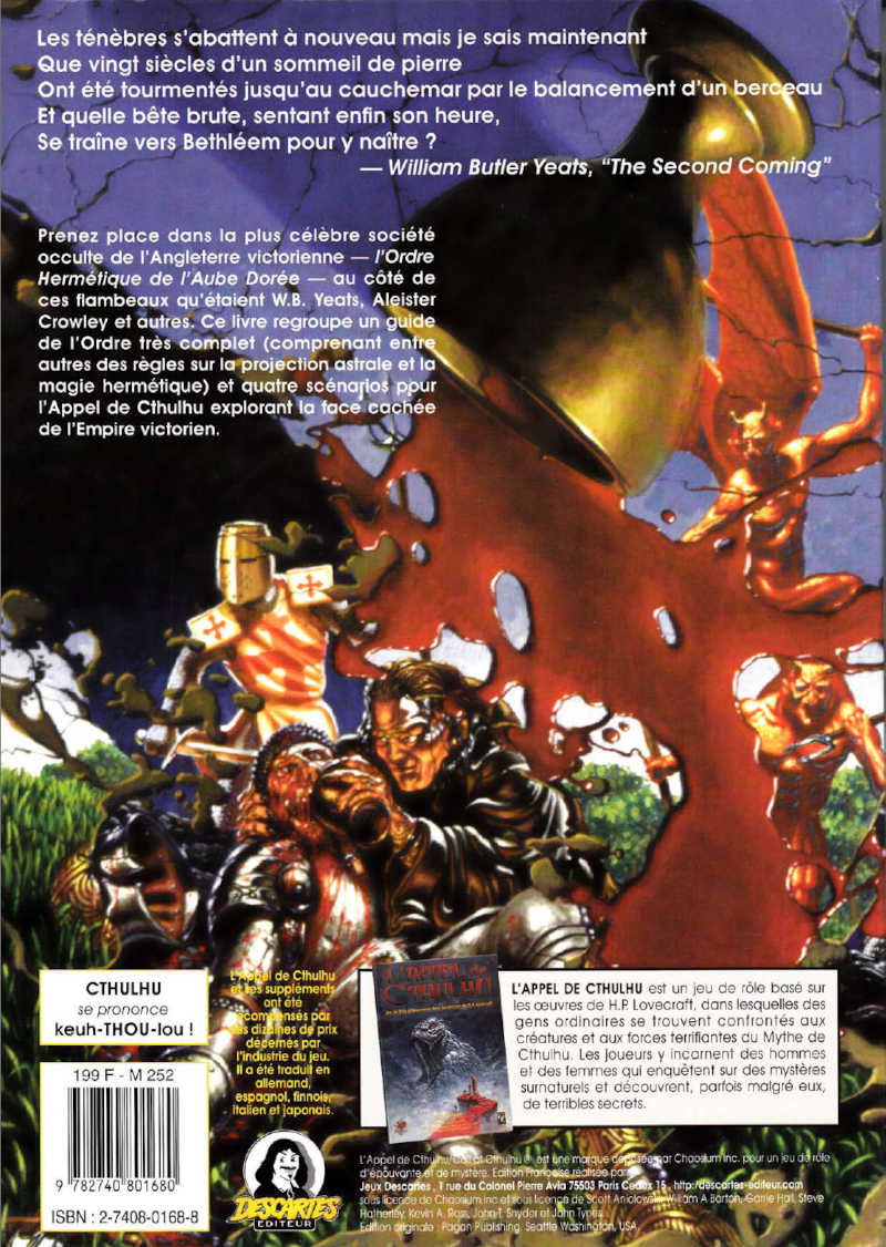 Prenez place dans la plus célèbre société occulte de l’Angleterre Victorienne – l’Ordre Hermétique de l’Aube Dorée – au côté de ces flambeaux qu’étaient W.B. Yeats, Aleister Crowley et autres. Ce livre regroupe un guide de l’Ordre très complet (comprenant entre autres des règles sur la projection astrale et la magie hérmétique) et quatre scénarios pour l’Appel de Cthulhu exploitant la face cachée de l’Empire victorien.